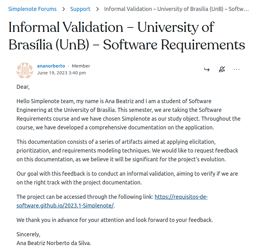 No processo de criação deste artefato utilizamos a técnica de Comprovação Informal². Basicamente, é uma tarefa de leitura de descrições em linguagem natural e do uso dos clientes para identificar problemas na expressão dos requisitos. Com base nisso, foi enviado uma mensagem para a equipe do Simplenote. Pode ser visualizada na Figura 1, uma captura de tela referente a mensagem.